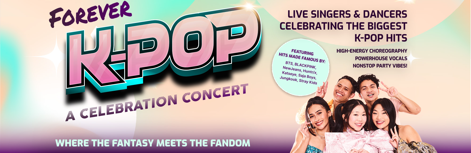 Inspired by the worldwide K-Pop phenomenon and recent smash-hit film KPop Demon Hunters, this high-octane production brings today’s biggest K-Pop hits to life on stage in a spectacle unlike anything audiences have seen in a tribute concert before. Designed as a high-energy K-pop revue, Forever K-Pop fuses electrifying vocals and choreography, bold costuming, and cinematic visuals into a dazzling live performance, capturing the pulse of the global K-pop movement while spotlighting iconic moments and breakout anthems including electrifying live singers and dancers performing songs made famous by BTS, BLACKPINK, Katseye, HUNTR/x, Saja Boys, NewJeans, and more.