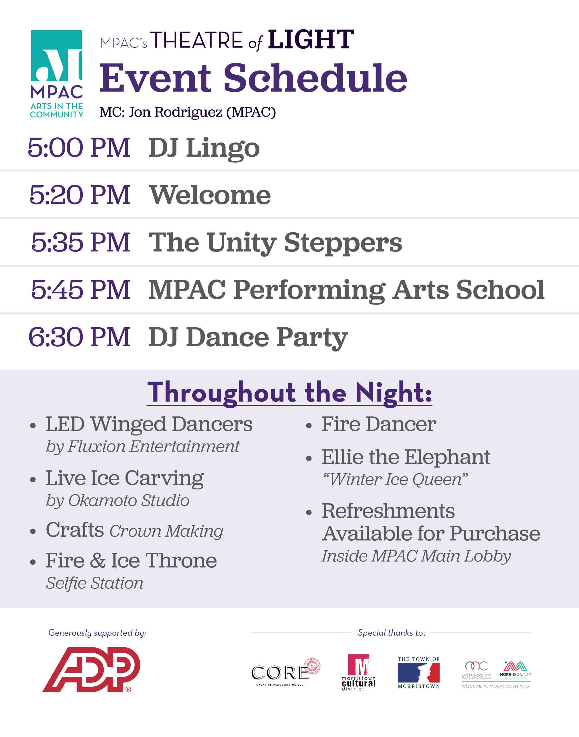 On November 23, Morristown transforms into a radiant winter wonderland featuring glowing Okamoto Studios ice sculptures, ethereal LED-winged dancers, life size puppets and the soul-stirring voices of the MPAC Performing Arts Company. Make a wish at the luminous Wish Upon a Star Tree, feel the beat with our high-energy of DJ Lingo, and be mesmerized by the fiery spectacle of our fire dancer.